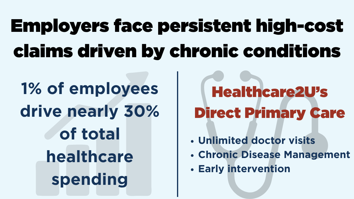 A recent EBRI study reveals that just 1% of employees drive nearly 29% of total healthcare spending; mostly due to chronic conditions like heart disease, respiratory disorders, and hypertension. Healthcare2U’s DPC model helps employers address this challenge by offering proactive, accessible, and affordable care.